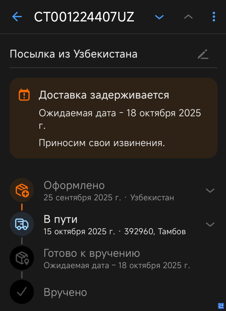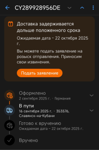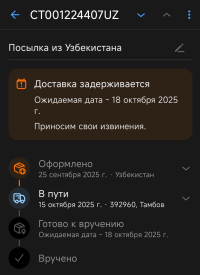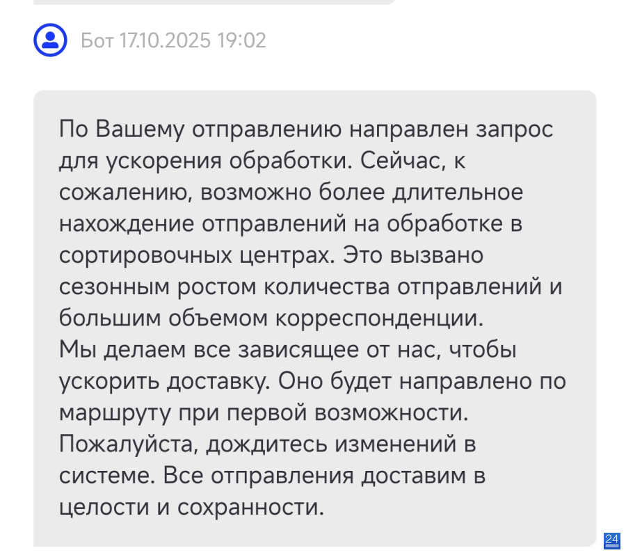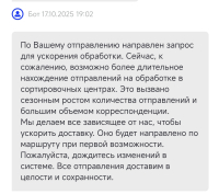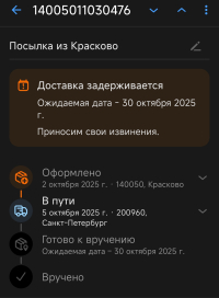 По вопросам доставки узнайте на почте, по данным сайту почты отправление задерживается и будет доставлено 19.10