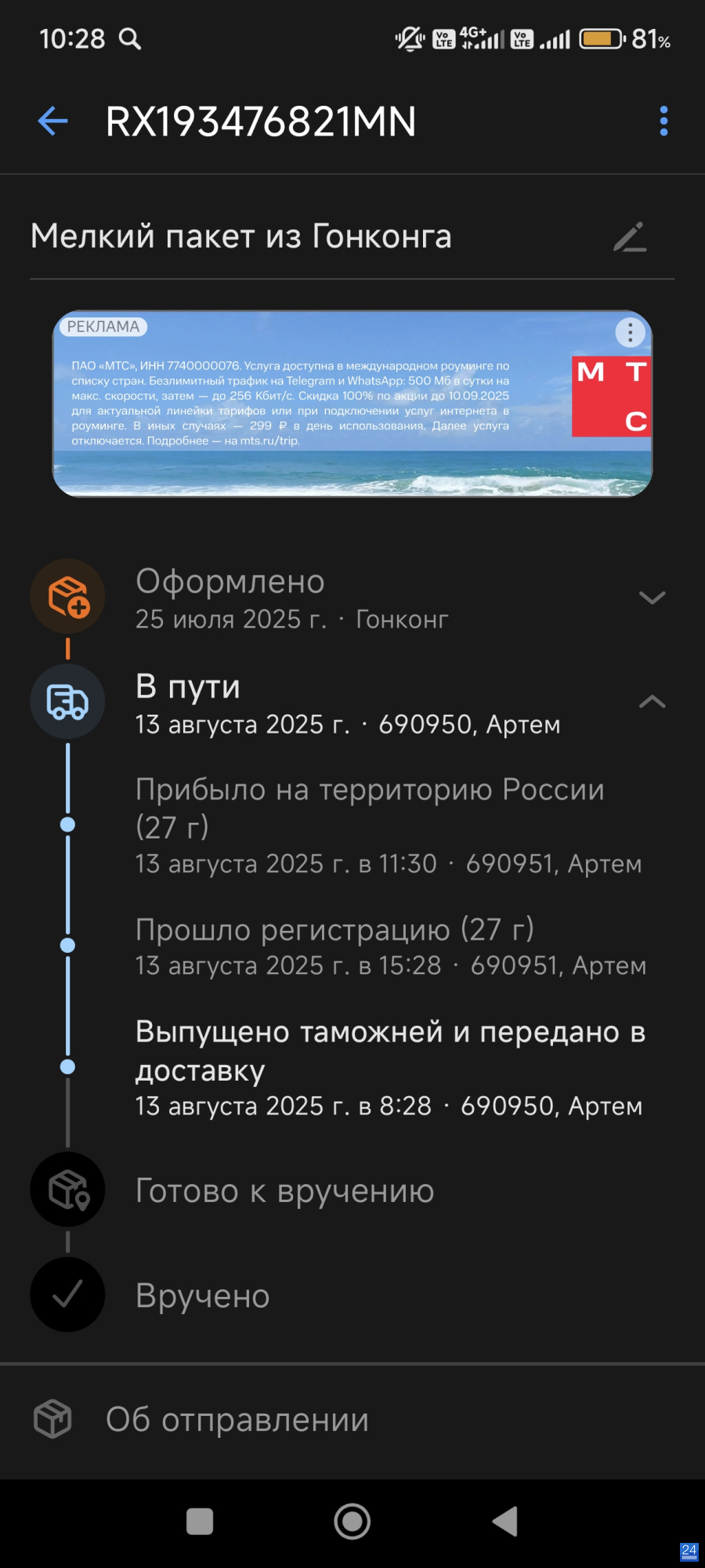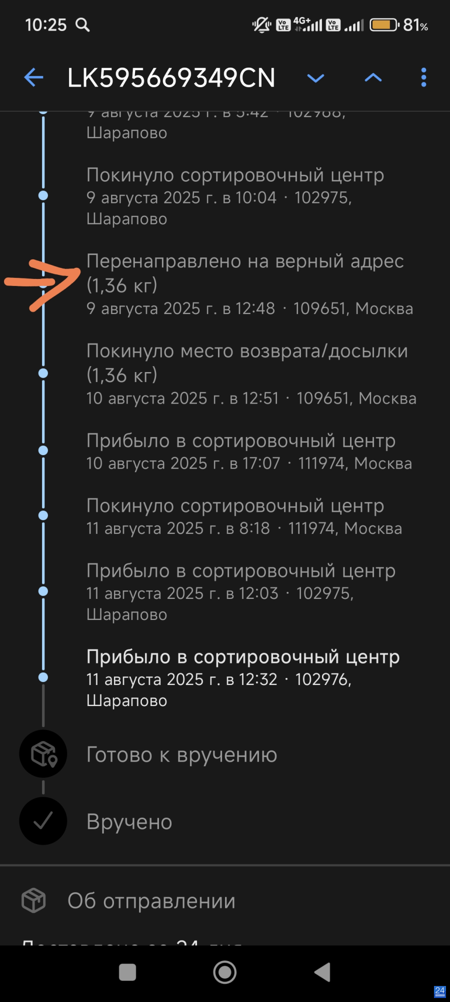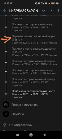 Добрый, Ваше отправление 13.08.2025 прошло сортировку и далее следует в отделение 283008. Пожалуйста, дождитесь изменения статуса в системе.