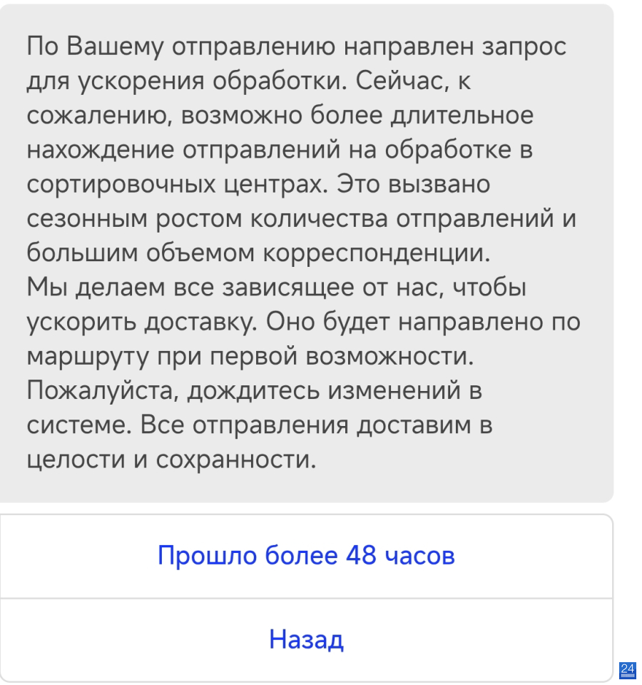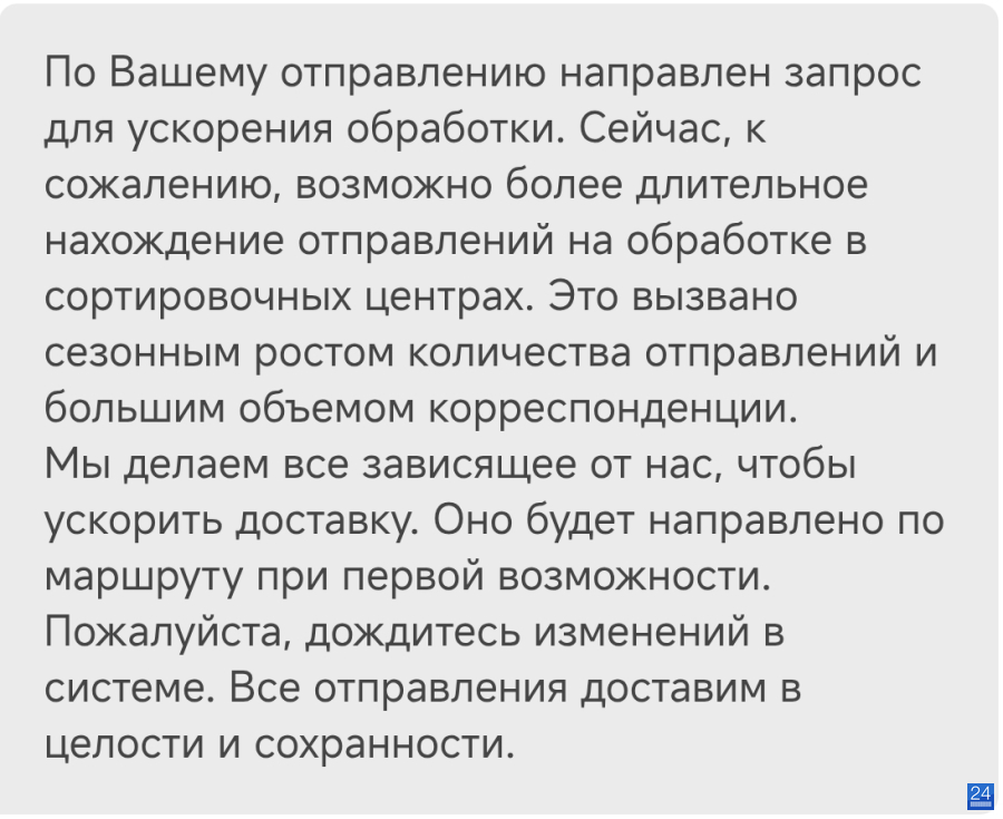 В связи с техническими неполадками, обработка почтовых отправлений проходит с задержкой.