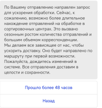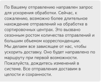 Во вторых мы к почте не относимся, ожидайте когда обновится статус, по статусу не покидала СЦ.