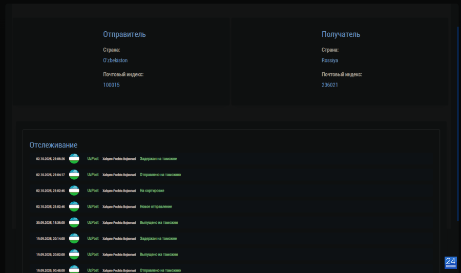 Отследить на сайте: https://track24.ru/?code=LX010958658UZ